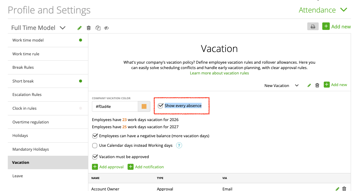 To show the department calendar to your staff, switch it on on the attendance time templates with “show every absence”. All users assigned to that template will have access to the department calendar.