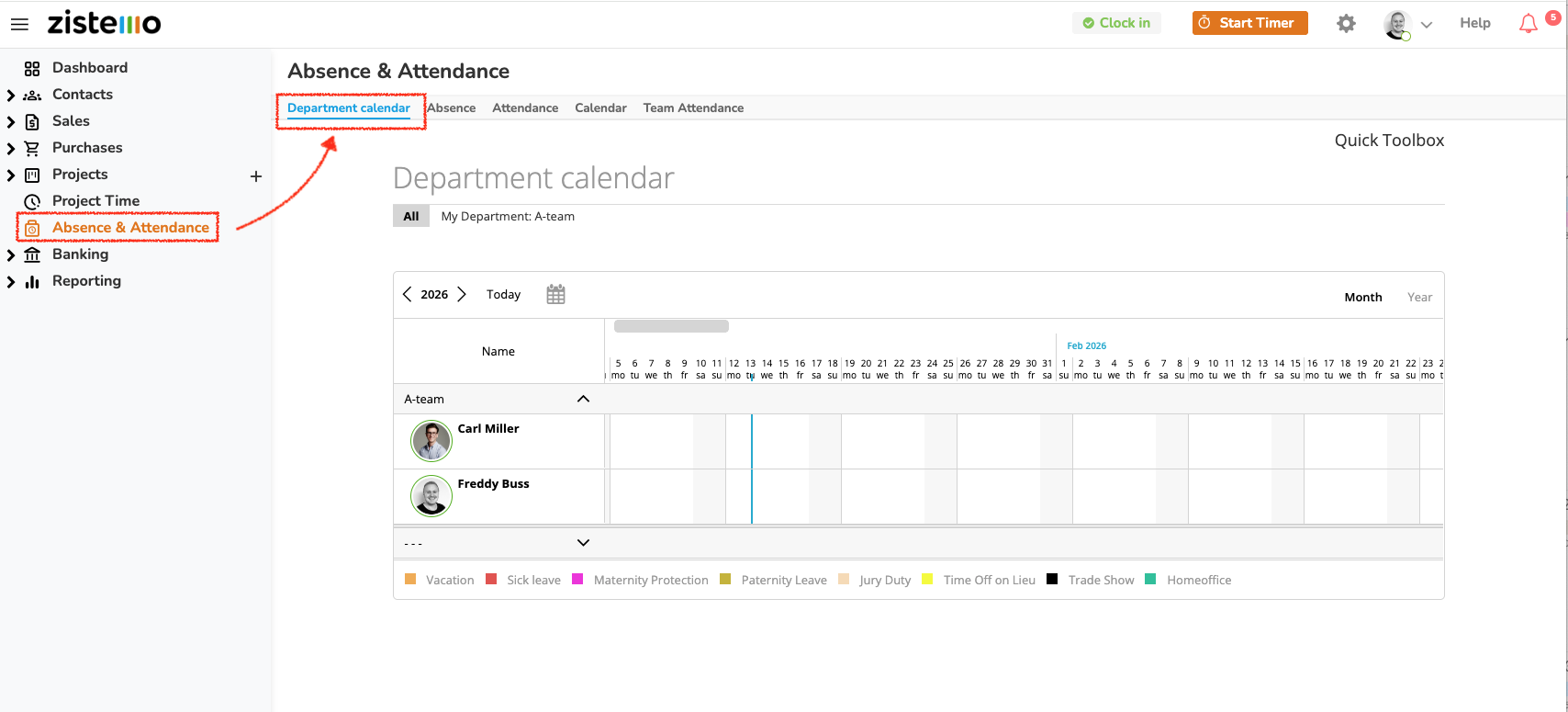 You can view either all departments or only your’s. You can switch between a monthly or yearly view: