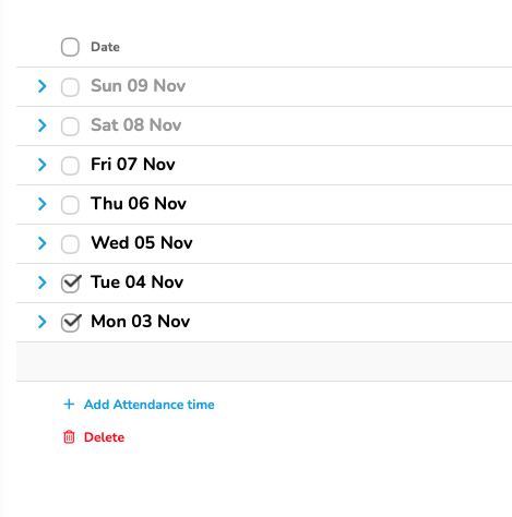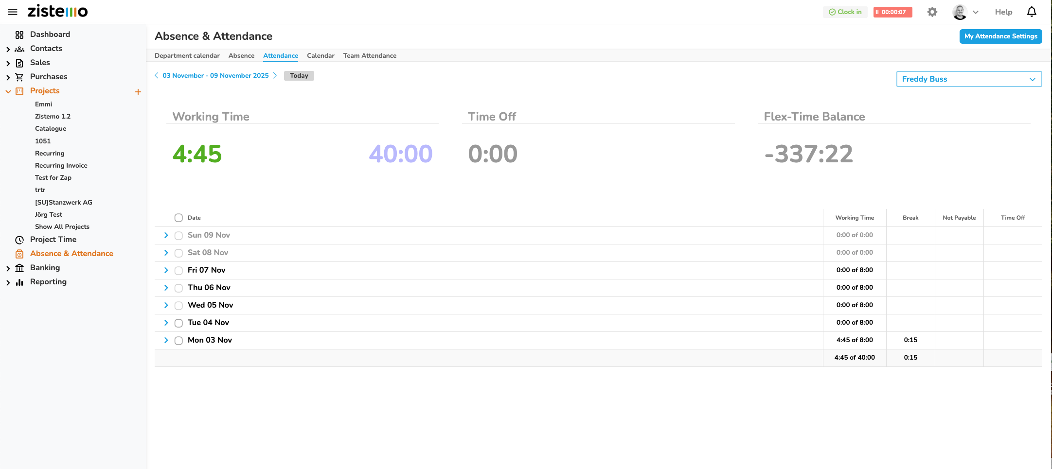 When navigating to the absence and attendance time menu point you’ll get by default to your attendance time list. view.