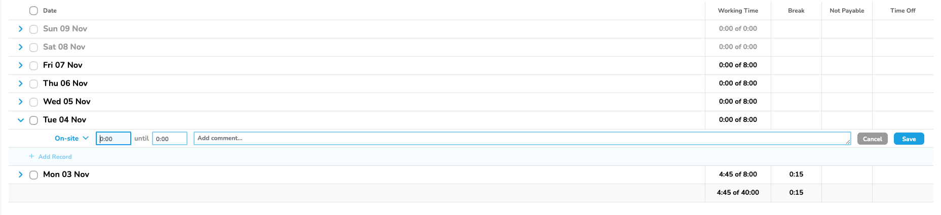 When adding a time record you have to add clock-in and clock-out time. Notes/comments are optional. By default any time record is on-site, you can change to off-site if needed.