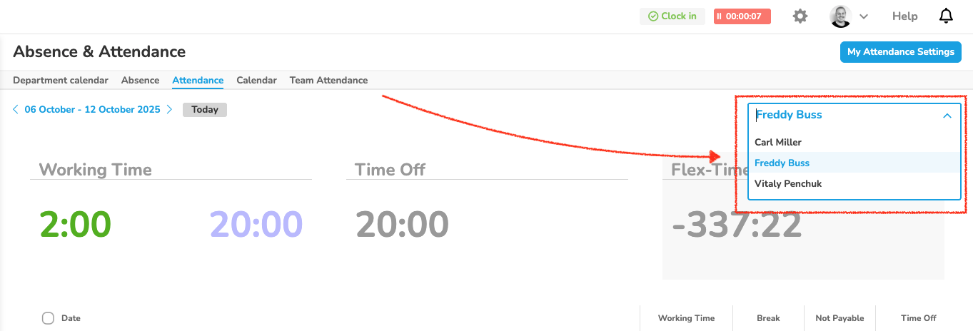 As an admin you can change the user on the attendance list view. This allows you to read, create, update and delete time records for other users.