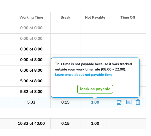 On the table you can see for each day your working time, break time and if a time record is not payable (outside of your work time rules, learn more here). Also, you see time off per day. Days that are nor declared as working days on your work time rules are shown with opacity.
