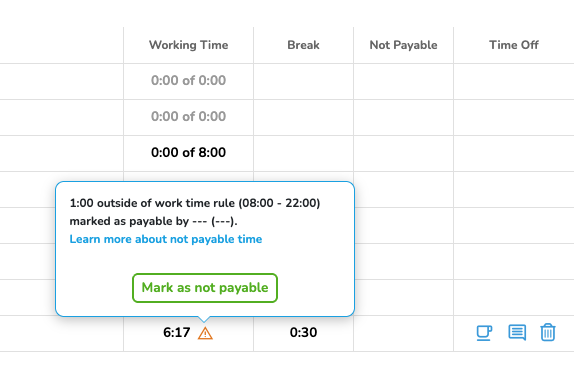 Time records outside of a user’s work time rule are not payable by default and are not calculated to the flex-time balance. As a admin you can mark those time records as payable. Click on time that is not payable, after on “mark as payable”.